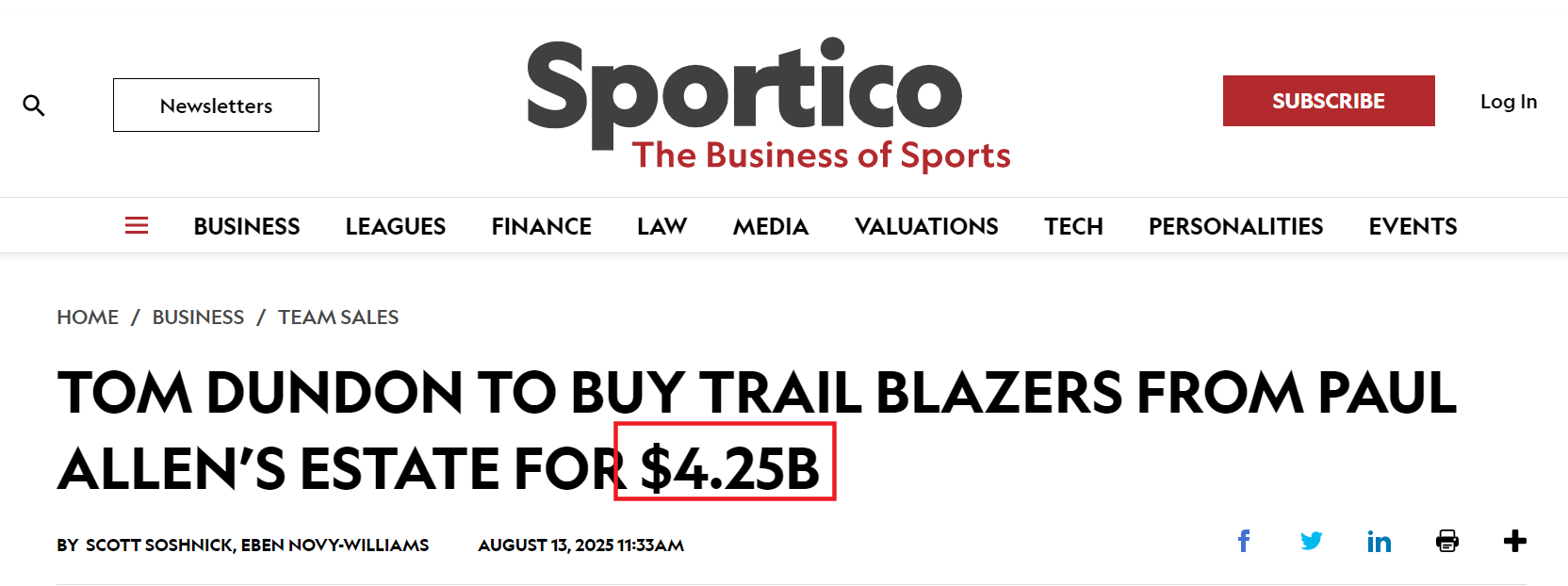 “我们很兴奋,”邓顿在一封电子邮件中表示。他没有回应关于价格的问题。艾伦的遗产管理机构对这笔交易拒绝置评。Sportico此前对开拓者的最新估值为36亿美元。