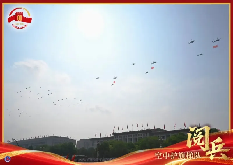 空中护旗梯队由45架直升机组成。中国共产党党旗、中华人民共和国国旗、中国人民解放军军旗,各悬挂在1架直-20通用直升机正下方,分别由2架直-10武装直升机组成左右僚机对其进行护卫;26架直-19武装直升机组成“80”字样,寓意纪念中国人民抗日战争暨世界反法西斯战争胜利80周年;3架直-8L运输直升机分别悬挂“正义必胜”“和平必胜”“人民必胜”条幅,7架直-20T直升机围绕标语形成三角队形,依次通场。