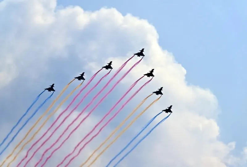 空军八一飞行表演队驾驶歼-10表演机,以超密集编队出场。7架战机在空中划出14道彩烟,寓意着中华民族14年可歌可泣的抗战历程,象征着14亿多中国人民奔向强国复兴的绚丽前景。